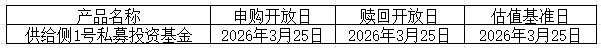 为方便您及时办理产品的申购、赎回手续,现将“供给侧1号私募投资基金”2026年3月的预约申购和赎回时间公布如下,供您参考: